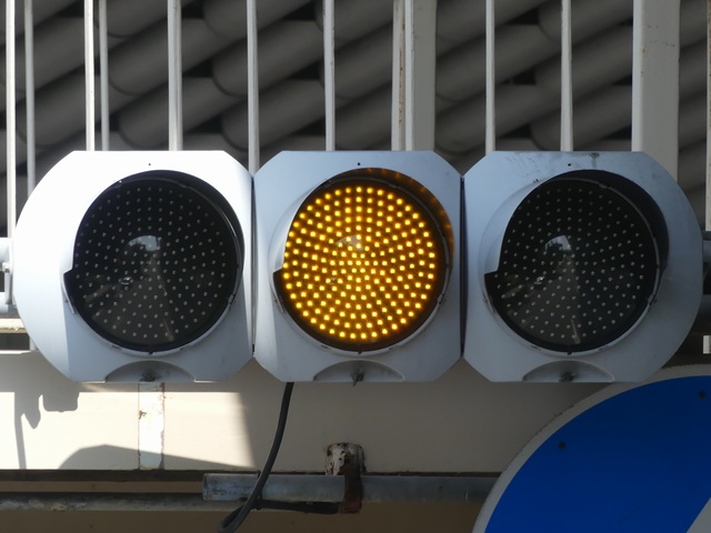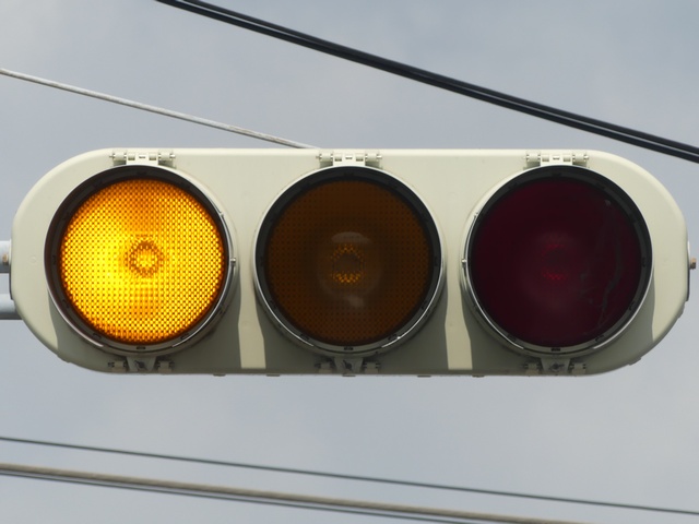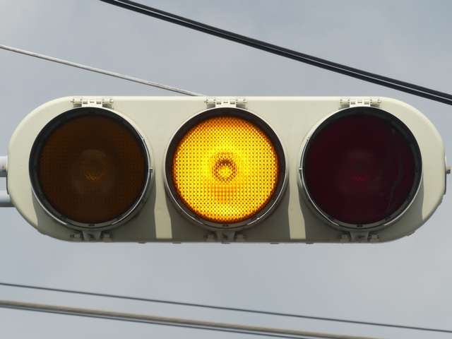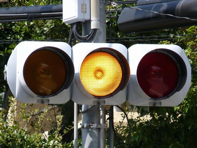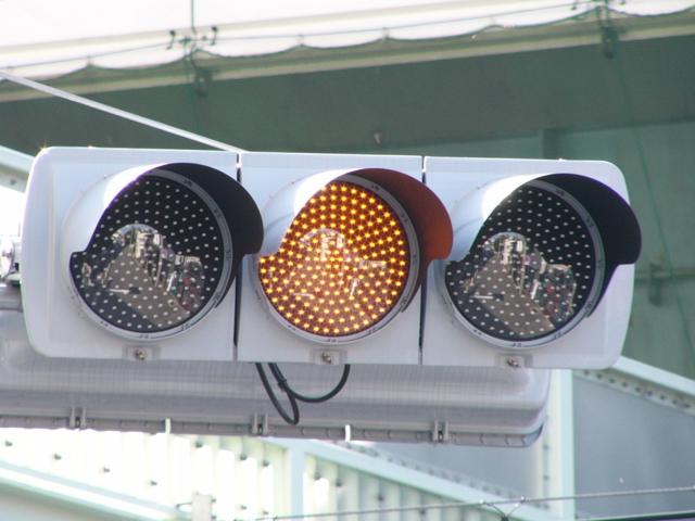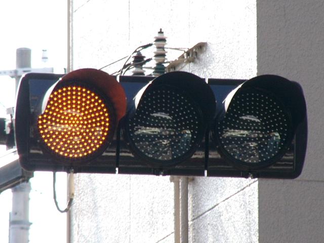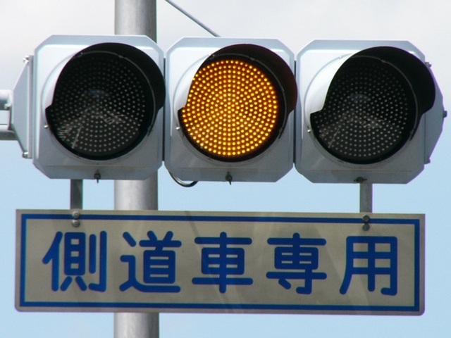 第2従道路で一方は交通量が少なく、もう一方は交通量が多いため、交通量の少ない方を「黄・黄・赤」灯器の左黄点滅、交通量の多い方を青信号で進行させています。