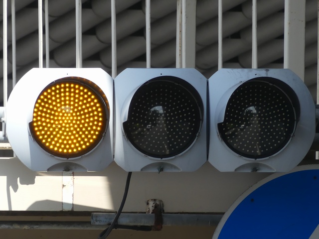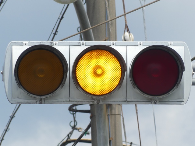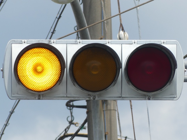 踏切の奥にあたる方(南進側)は、手前の踏切信号を見落とさないようにさせるためか、青信号にならず、「黄・黄・赤」灯器の左黄点滅により注意させながら進行させます。南進側踏切手前には、「赤・赤」灯器が設置され一時停止により踏切を通行させますが、前方交差点が赤信号の時には、赤信号になり踏切への車両の進入を防ぎます。(なぜか、踏切の赤信号を完全に無視して踏切に進入し交差点の手前まで進行してしまう車両をよく見かけますが・・。)
