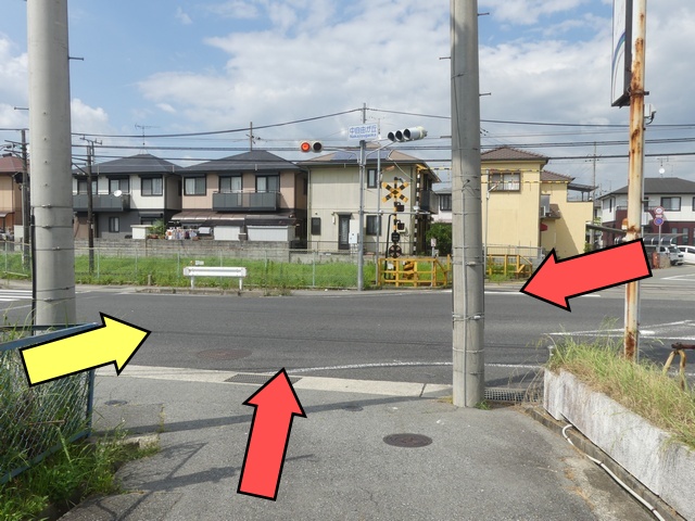 踏切の奥にあたる方(南進側)は、手前の踏切信号であると勘違いされる可能性があるため、青信号にならず、赤点滅により交差点手前で一時停止させ進行させます。南進で交差点に向かう車両は、まず踏切で道交法に従い一時停止した後、交差点手前で赤点滅に従い一時停止し、交差点に進入することになります。