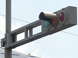一見デザイン灯器のように見えますが、アームと一体になった箱に丸型灯器を収納し、灯火(蓋)の部分だけ露出するようにしたものです。丸型灯器で矢印灯器を接続する位置(赤灯火やや中央寄りと青灯火やや中央寄り)に蓋がついています。