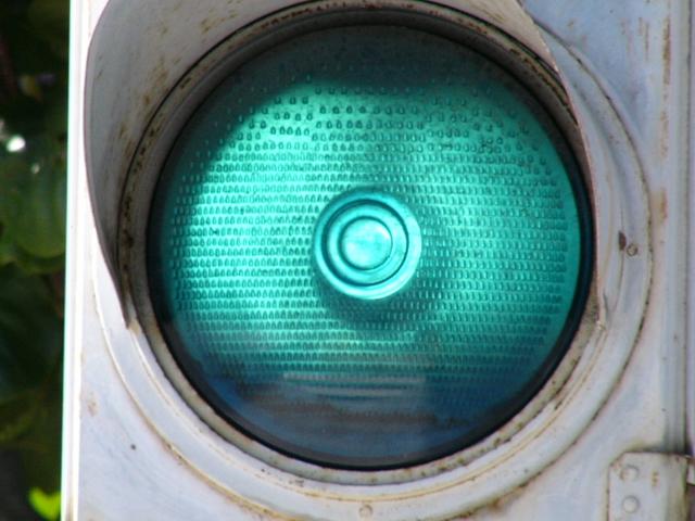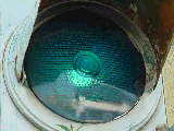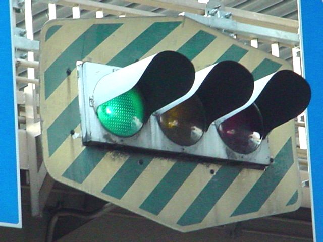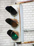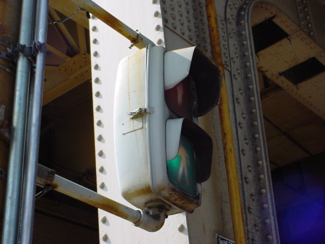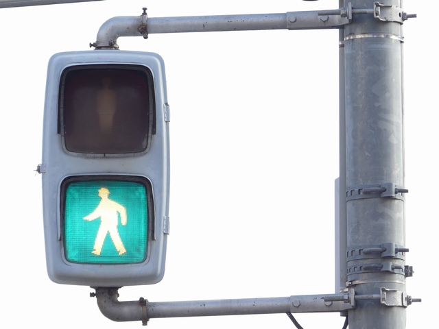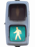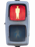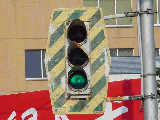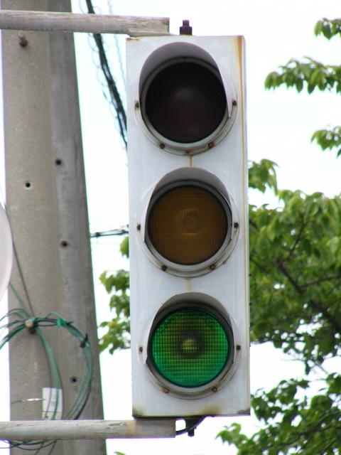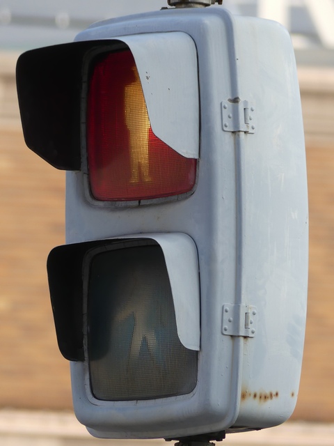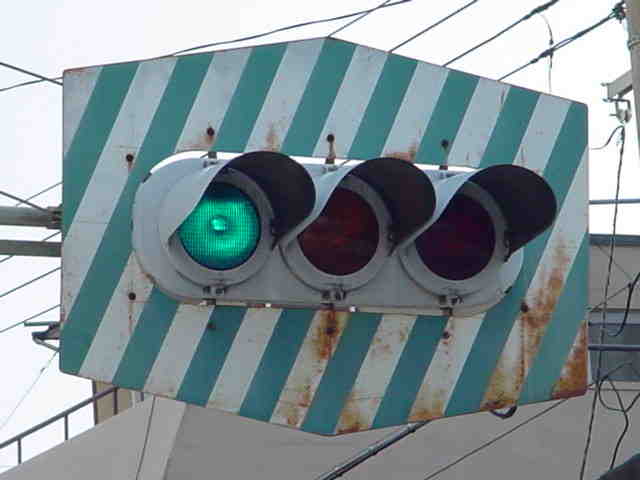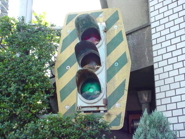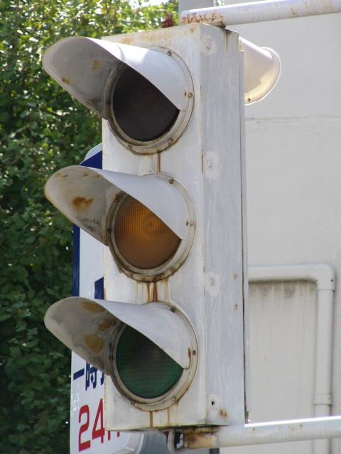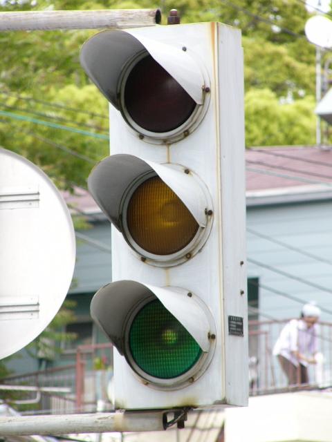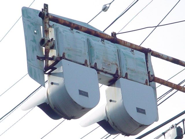 日本信号製の初期の歩行者用灯器で青のフードが短いです。