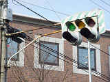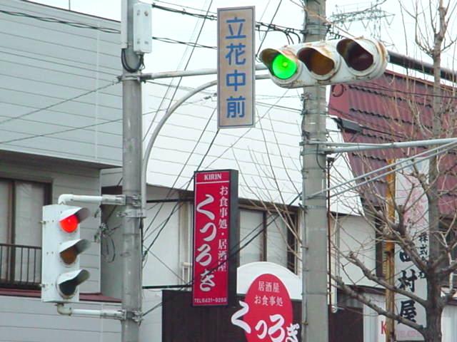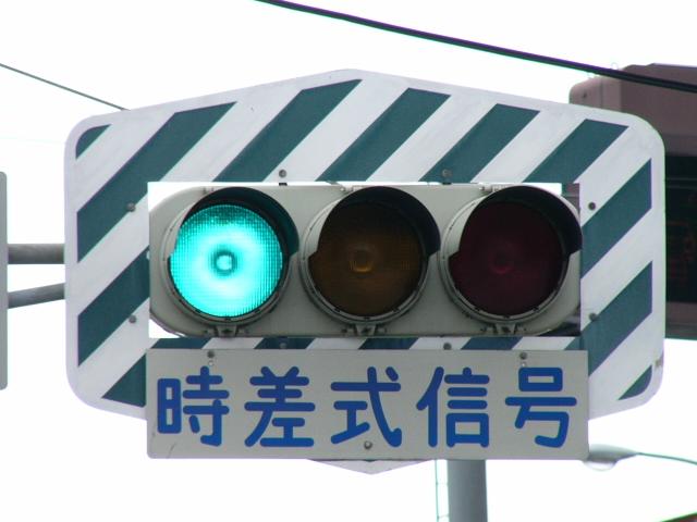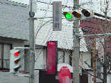 日本信号製の初期の歩行者用灯器で青のフードが短いです。この交差点に6台設置されていました。