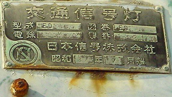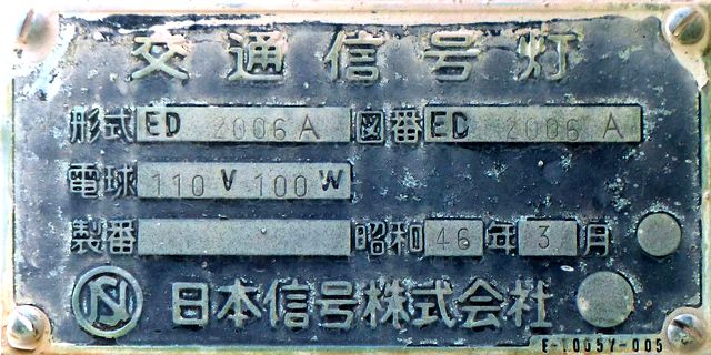 日本信号製の初期の歩行者用灯器(昭和43年6月製造)で青のフードが短いです。銘板は側面についています。レンズは後の世代のものに交換されているようです。