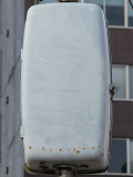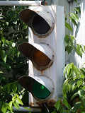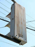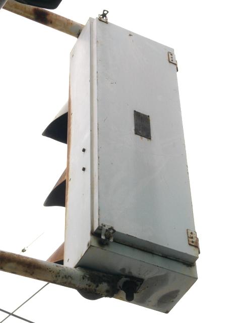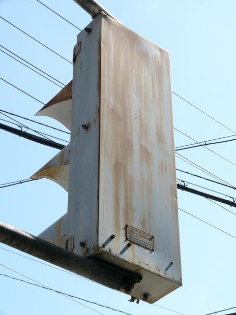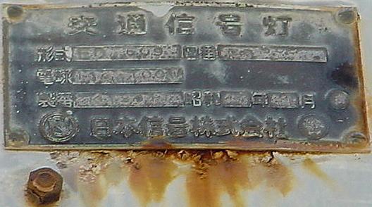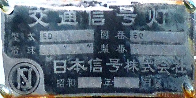 日本信号製の直径200mmレンズ灯器です。裏扉です。銘板が背面に付いていますが、銘板が横向きになっていることから、横型灯器をそのまま縦に設置しているようです。