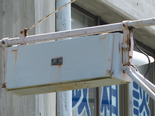 なんと丸型灯器に設置されています。しかも、他のものとは、かなり趣が異なります。アーチ状の看板の下に灯器が設置されているため、灯器を目立たせるために背面板を設置しているようです。