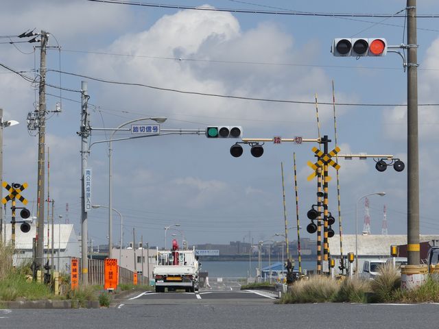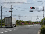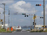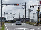 信号交差点と信号のある踏切が近接しているため、連続で通過する場合の奥側の灯器に青灯のみ距離制限のSD制限フードが装着されています。