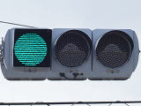 信号交差点と信号のある踏切が近接しているため、踏切側から交差点に進入するときの灯器に青灯のみ距離制限のSD制限フードが装着されています。