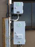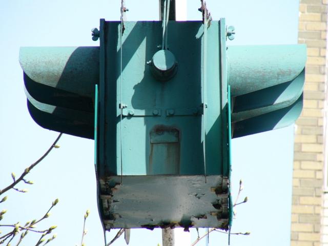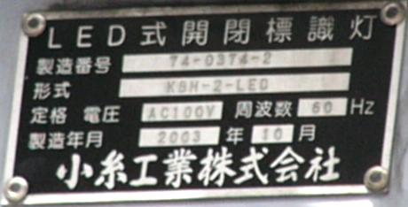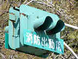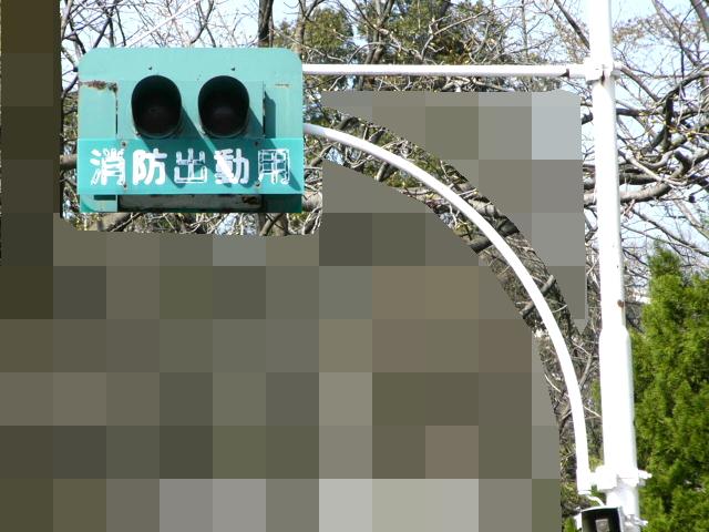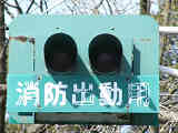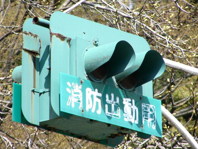 消防署の出口に設置された灯器です。レンズは赤色で裏側から「出」「動」の形にマスキングしてあります。緊急車両が出動する時に点灯、または点滅すると思われます。灯箱が下に伸びており、1つの電球で両面のレンズを照らしているのでしょう。
