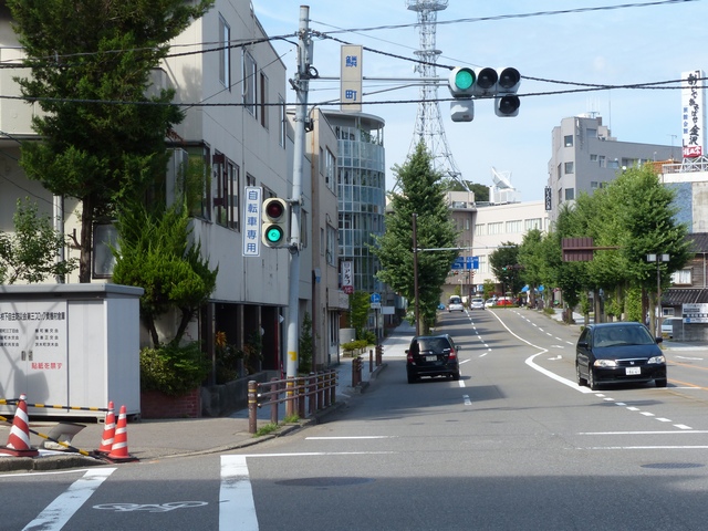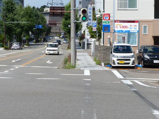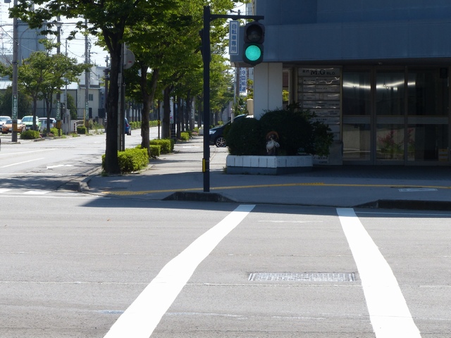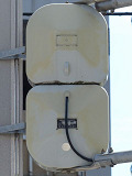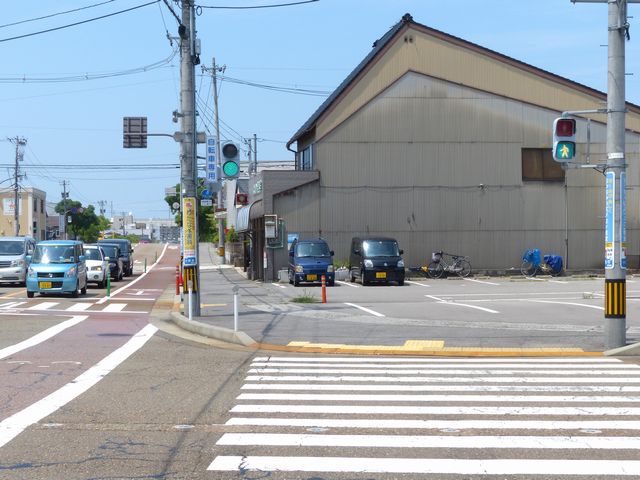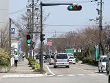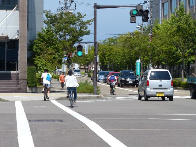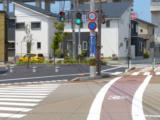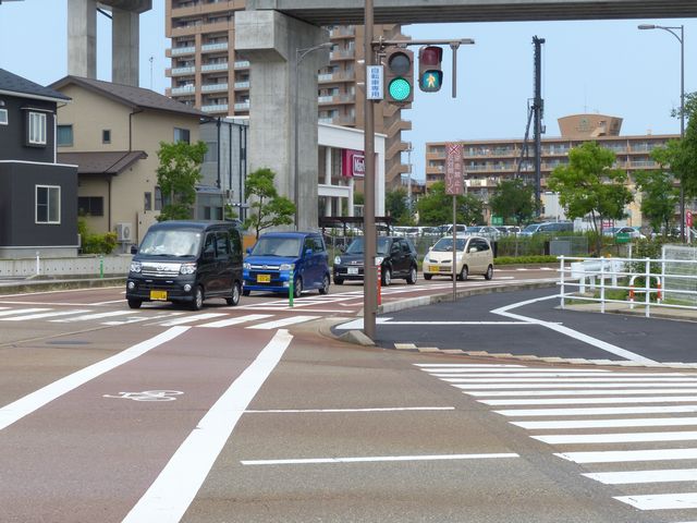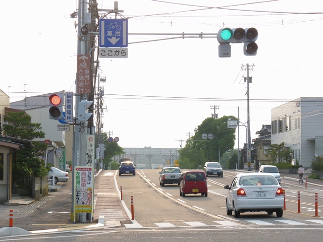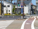 自転車専用通行帯は当然1方向通行ですが、自転車横断帯には通行方向についての規定がないため、自転車通行帯の逆行側にも灯器が設置されています。