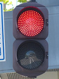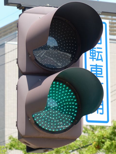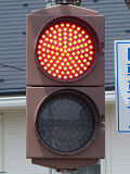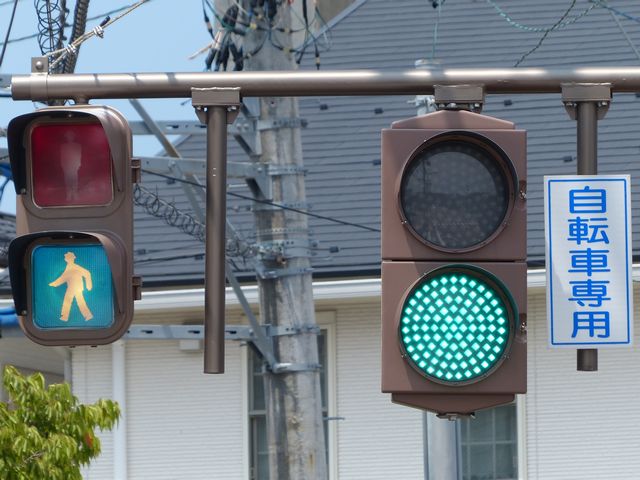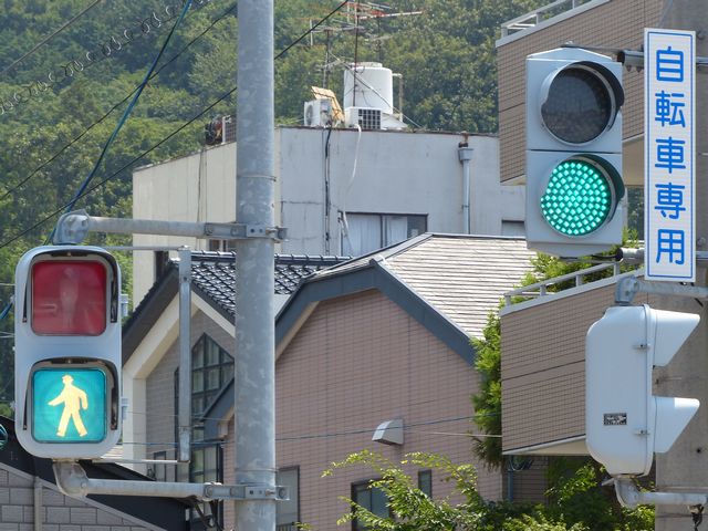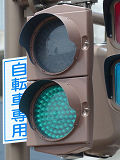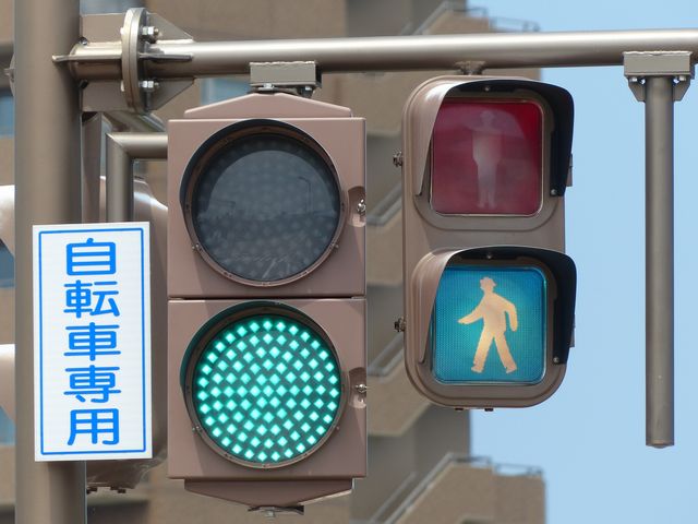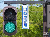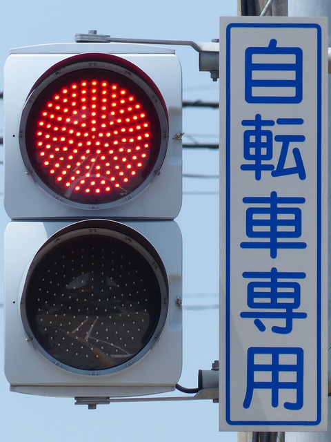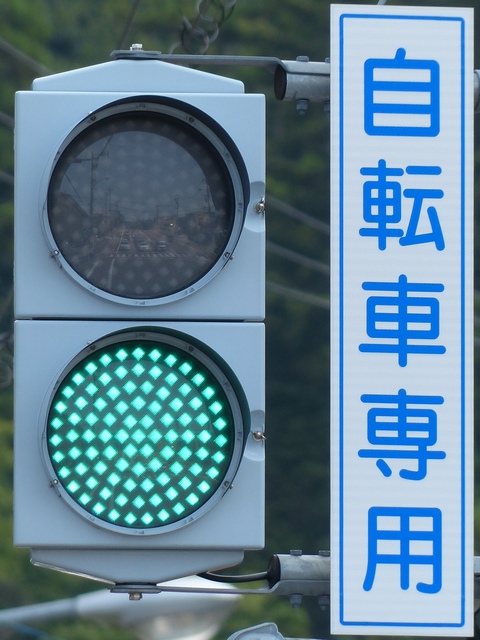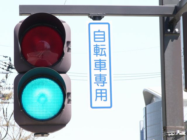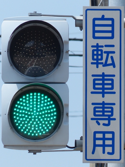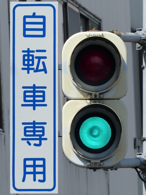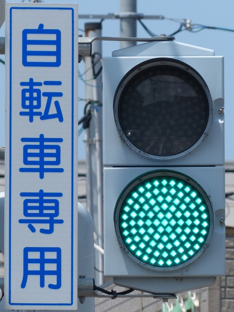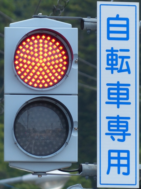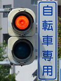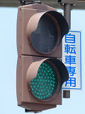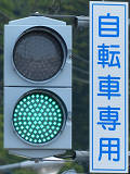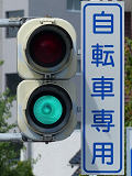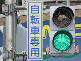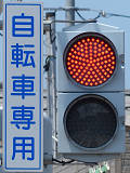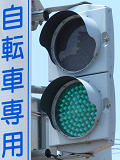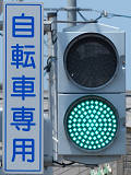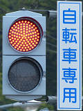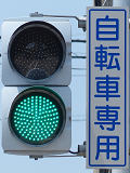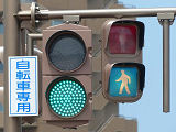 以前は、横断歩道のすぐ横に自転車横断帯が設置されていたため、歩行者用灯器による信号を「自転車・歩行者専用」としていましたが、自転車横断帯が自転車専用通行帯の延長上に移設されたことに伴い、「自転車専用」の2位式灯器が増灯されました。信号サイクルは、青点滅することを含め、併設された歩行者用灯器の信号と同じですが、人形の無い信号の青点滅の意味は道路交通法施行令では規定されていません。