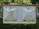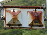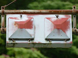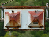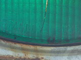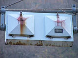 釜谷第一隧道北側坑口には、角型灯器が設置されていますが、上のものと形状は同じですが銘板はありません。2004年11月当時で、銘板ありの灯器に錆が見られたのに対し、銘板なしの灯器は、2018年9月現在でも錆がほとんど見られないため、銘板ありの灯器より新しいものと思われます。