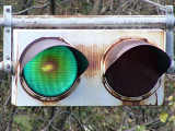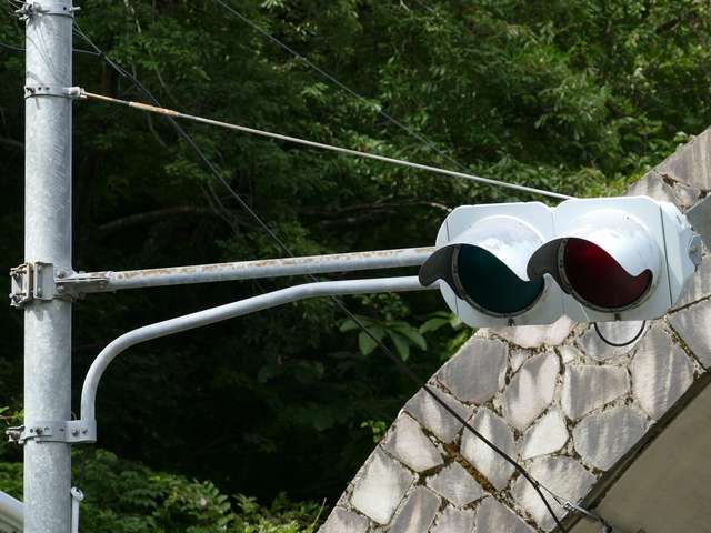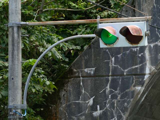 桑島隧道南側坑口には、京三製作所製の灯器が設置されています。2018年9月現在、電球切れのためか滅灯しています。以前は点灯していました。