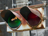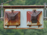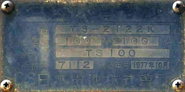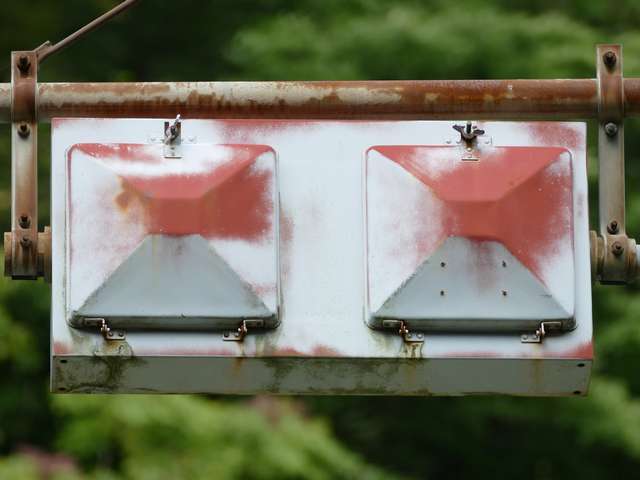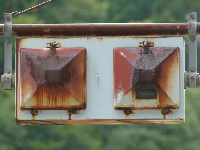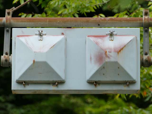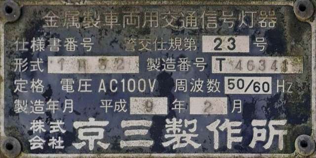 東二口第一隧道南側坑口には、角型灯器が設置されていますが、レンズ間が離れた見慣れない形状のものです。銘板があり、日本電池(現GSユアサ)製の1977年10月製造で名称は「二位式信号機」となっています。