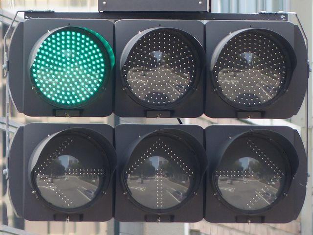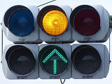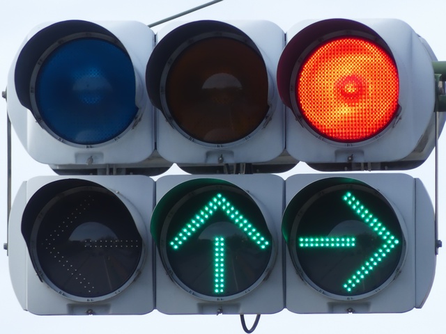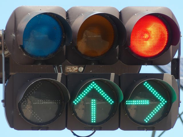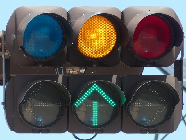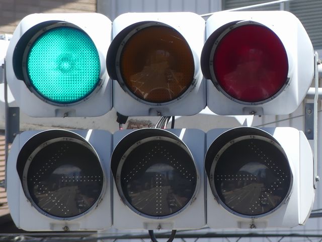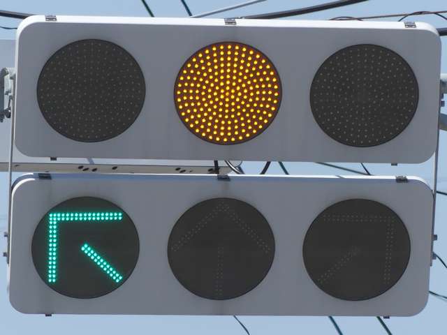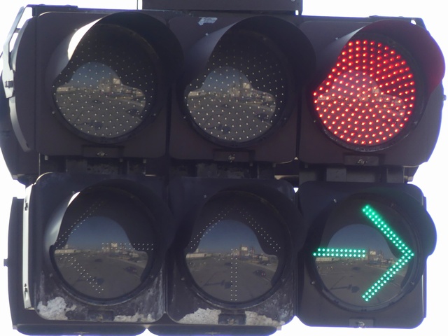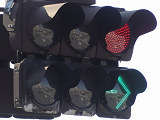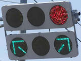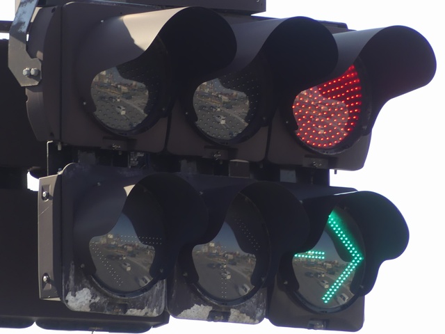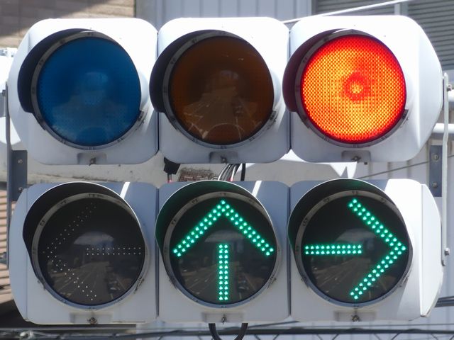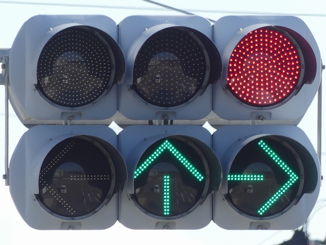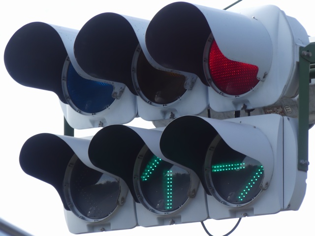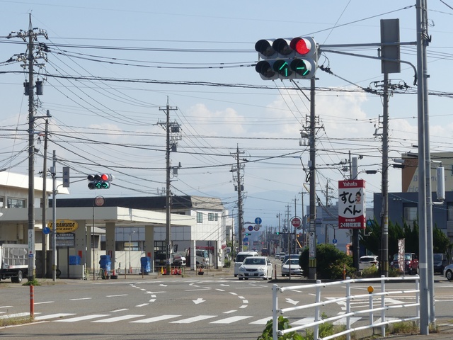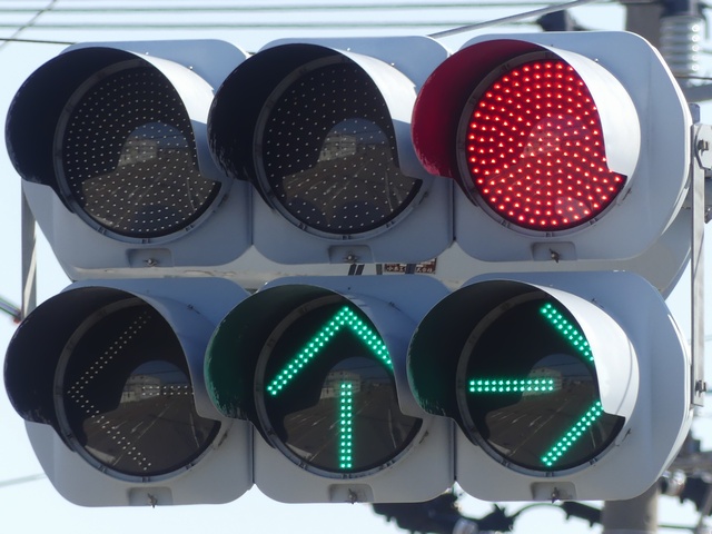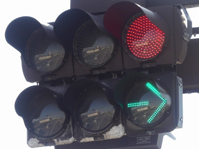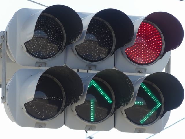 石川県では3方向のすべての矢印を使用しない場合でも、3位式の矢印灯器を設置する場合があります。今後の信号サイクル変更に備えて設置している場合もあるかもしれませんが、道路のない方向や指定方向外進行禁止規制で終日進行できない方向の矢印が含まれている場合もあります。