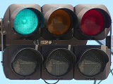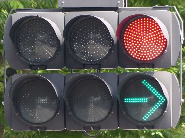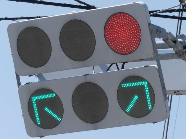Y形交差点で、左斜め(直進)と右斜め(右折)の矢印しか使用しませんが、3位式の矢印灯器を設置し、使用しない真ん中の部分に真上を指す矢印を配置しています。