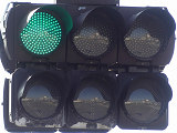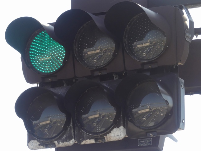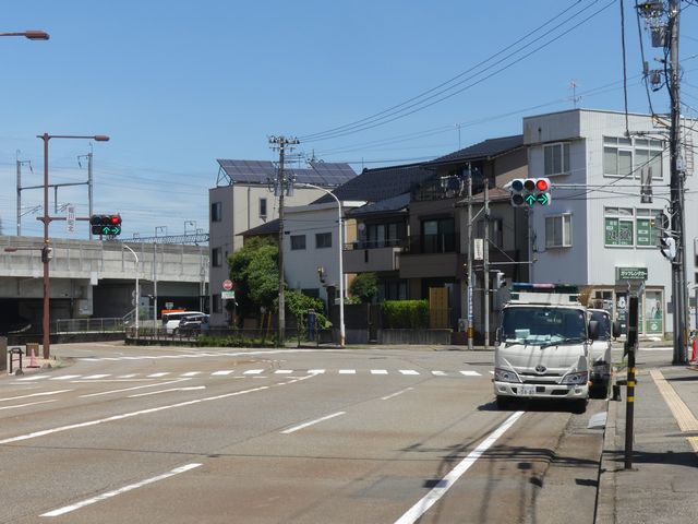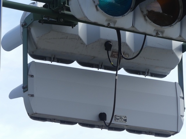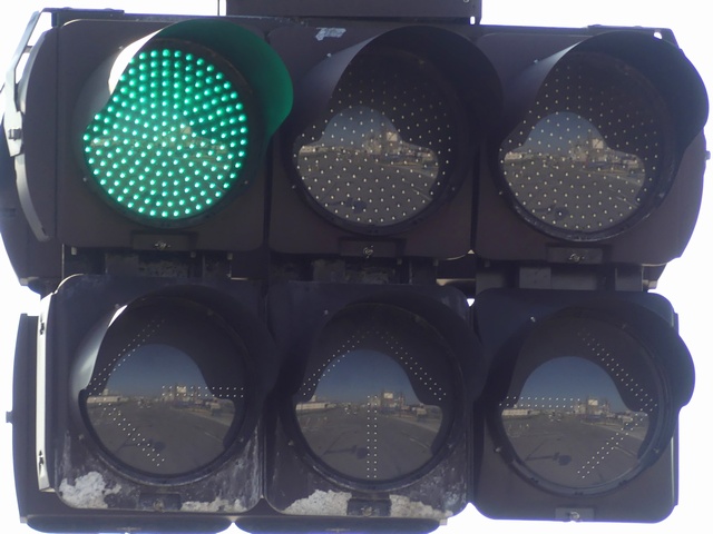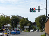 この交差点では、直進矢印を使用しませんが、直進矢印を含んだ3位式矢印灯器(実際には1位式灯器3つ)を設置しています。なお、元は┤形交差点でしたが、右方道路が開通し右折矢印灯器が追加されました。