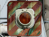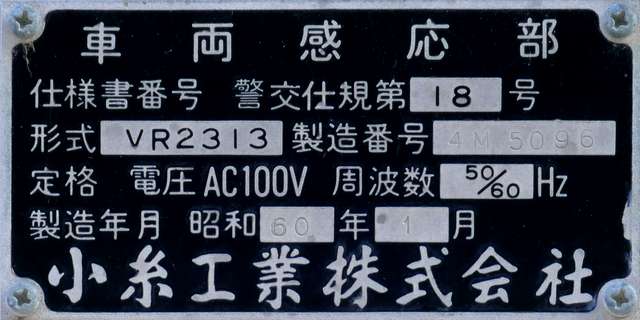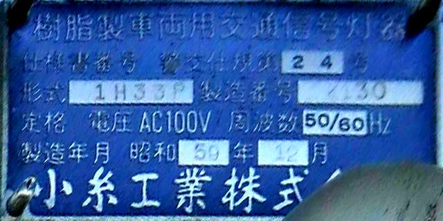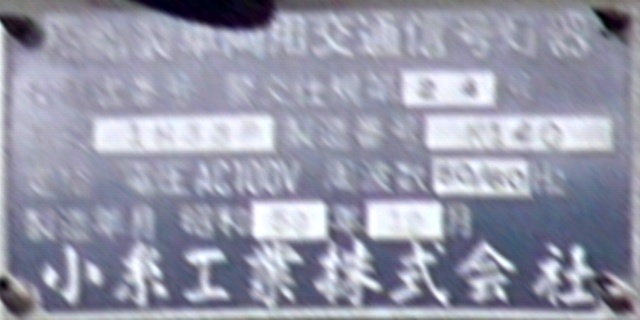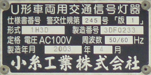 西進用の灯器は、なぜか「樹脂製個別形一灯点滅用交通信号灯器」の銘板となっています。製造番号は、東進用灯器と連番です。