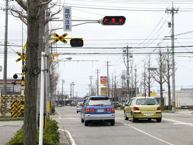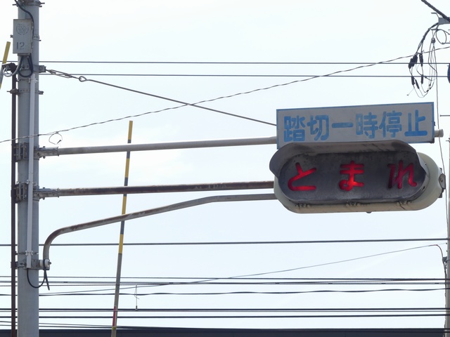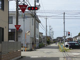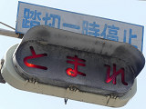踏切の先の見通しの悪い交差点のため、「とまれ」灯器で一時停止規制を強調しています。ただし、灯器の電球切れか制御機の故障か感知器の故障のため、車両が接近しても点灯(点滅)しません。
