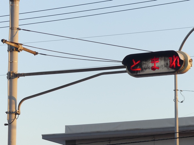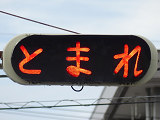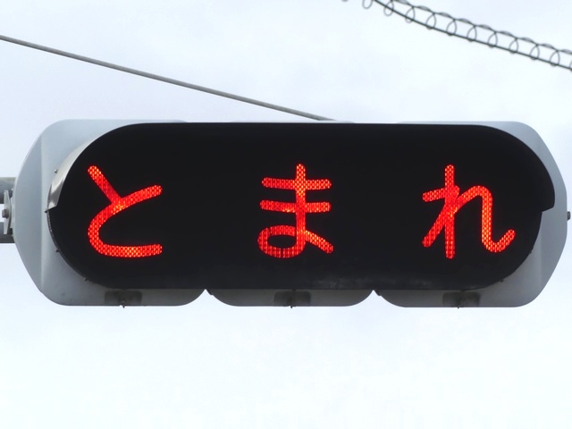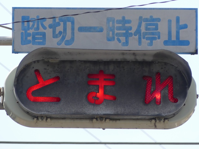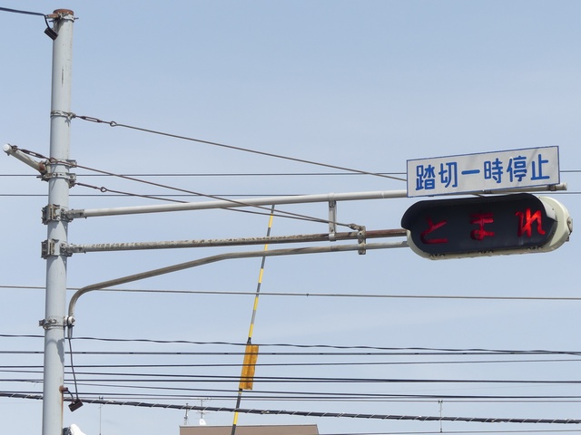踏切に設置されており、一時停止することを強調しています。「踏切一時停止」標示板が併設されています。手前に感知器があり、車両を感知した時に「とまれ」の表示がしばらくの間点滅します。踏切とは連動していません。