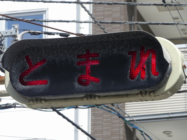 道路幅が同じくらいの道路同士の交差点のため、一時停止規制を見落とさないように「とまれ」灯器で規制を強調しています。2020年1月現在、「れ」が電球切れしています。