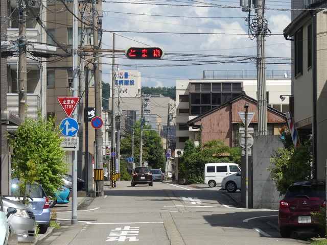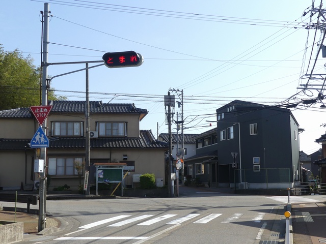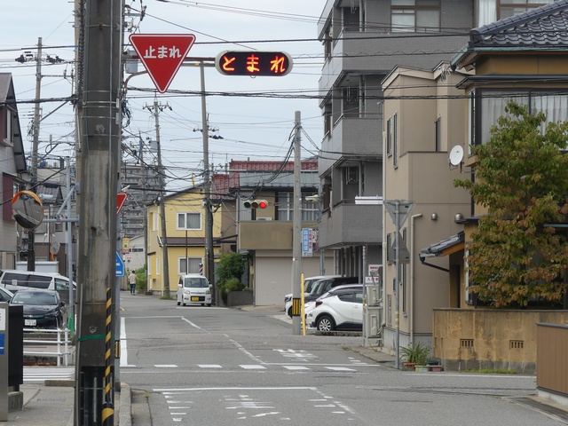 すぐ先に信号交差点があるため、一時停止規制を見落とさないように「とまれ」灯器で規制を強調しています。石川県の「とまれ」灯器は、通常、手前の感知器で車両を感知したときのみ「とまれ」表示が点滅しますが、ここでは手前に感知器があるにもかかわらず常時点滅しています。