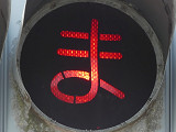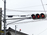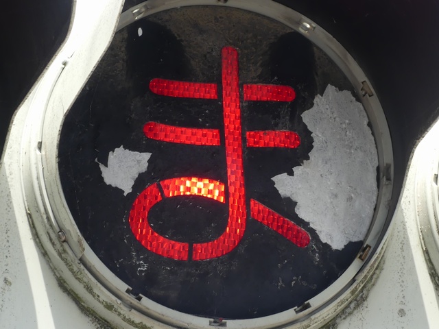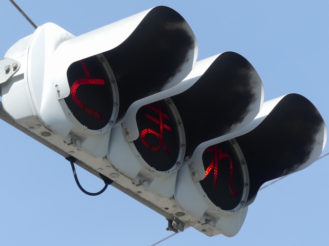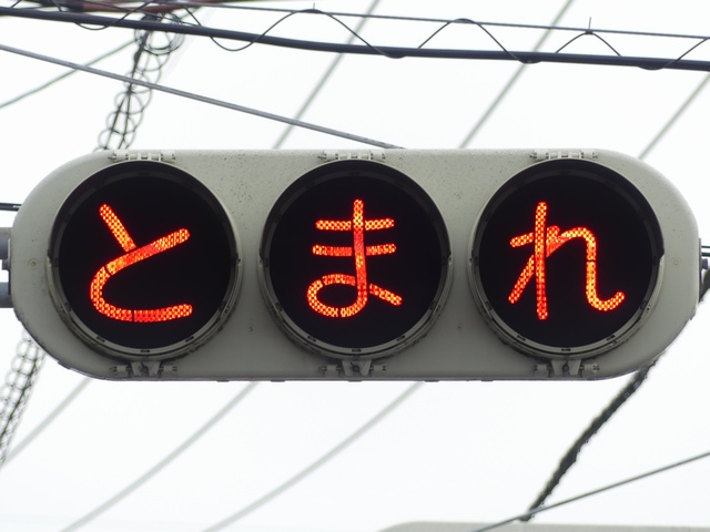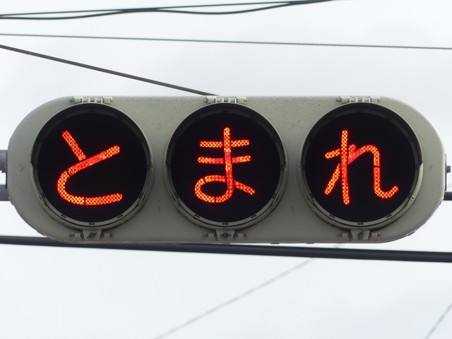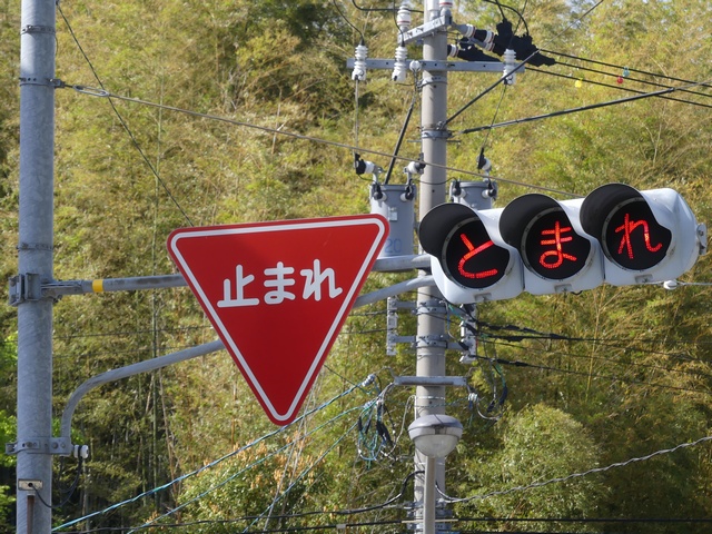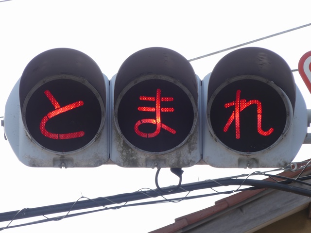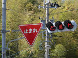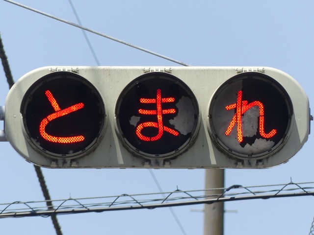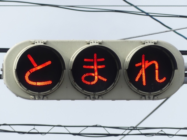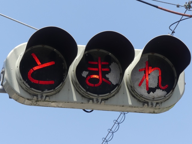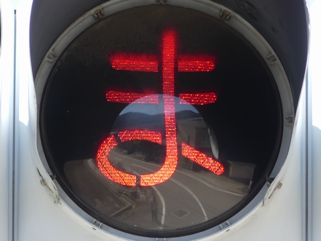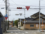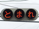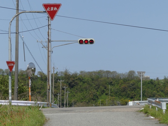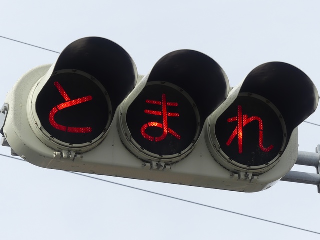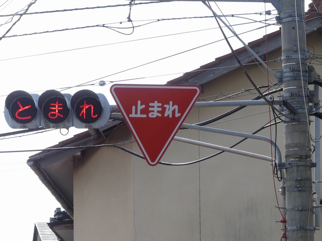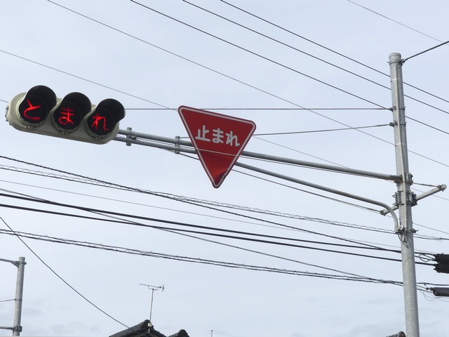 県内の「とまれ」灯器には、前面の全面にカバーをかぶせてあるものと、それぞれのレンズにカバーをかぶせてあるものがあり、こちらは後者のタイプです。