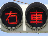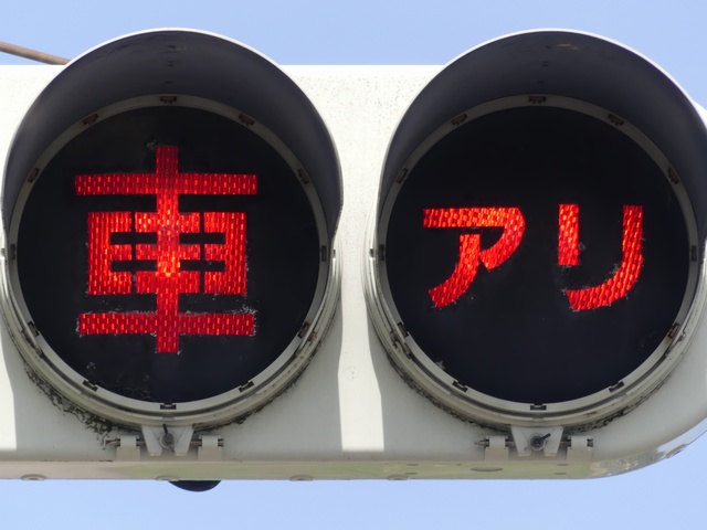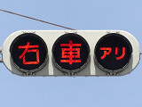 信号のない交差点の非優先道路側(一時停止規制あり)に「右車アリ」と表示する灯器が設置されています。右方道路約90m先にある感知器が接近車両を感知すると、約10秒間表示が点滅します。4文字であるため、「アリ」をカタカナにして、1つのレンズに収めています。