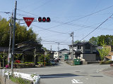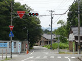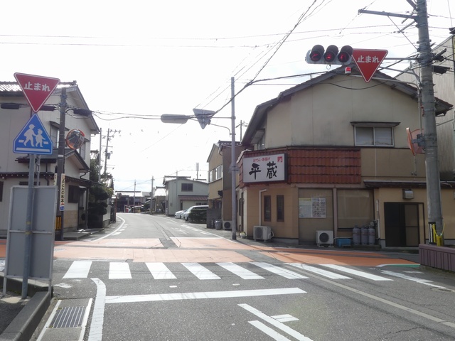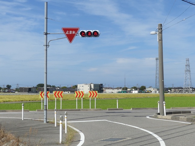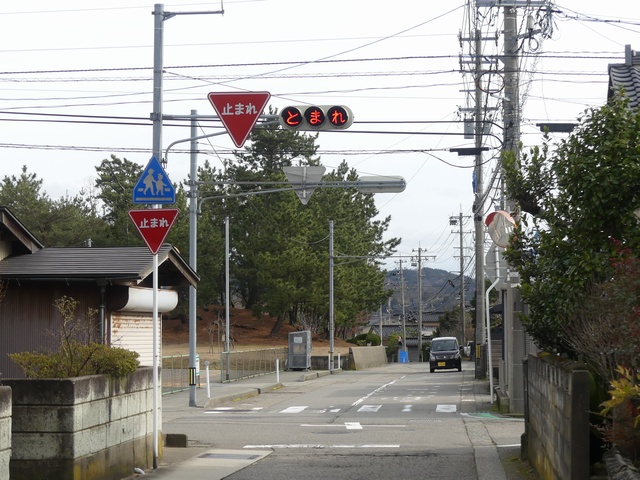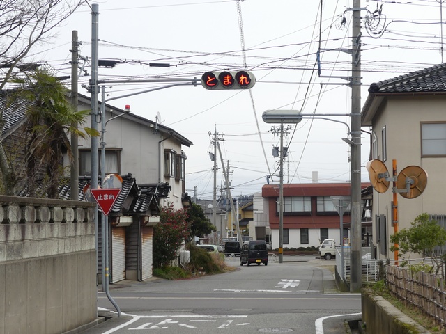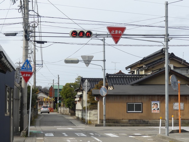 信号柱には「寺井町(現能美市)」のラベルが貼られています。道路管理者名のラベルにも見えますし、県公安委員会が設置場所を管理するために町名のラベルを貼ったようにも見え、道路管理者か県公安委員会かどちらが設置したものか分かりません。道路は市道と思われます。なお、「一時停止」標識は県公安委員会が設置します。