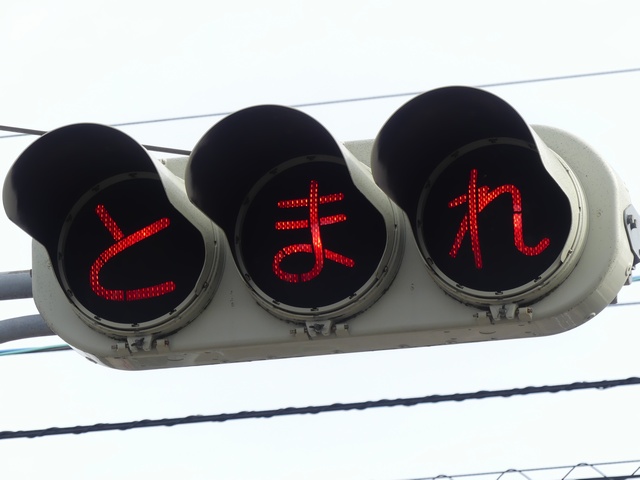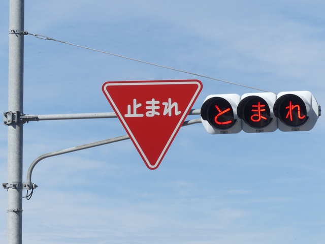 信号のない交差点の一時停止規制側道路に「とまれ」と表示する灯器が設置されています。常時、表示が点滅しています。