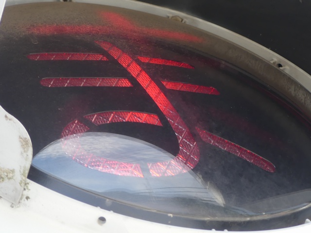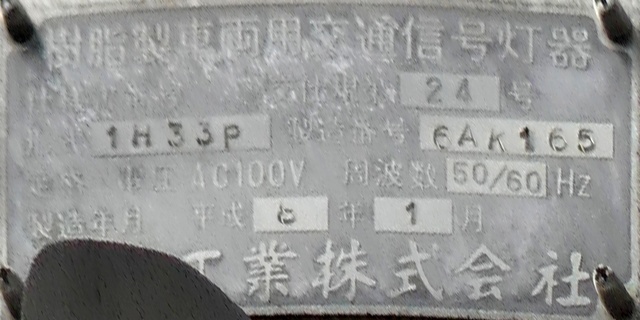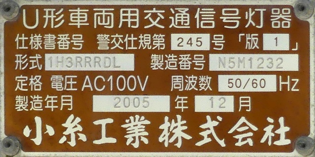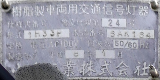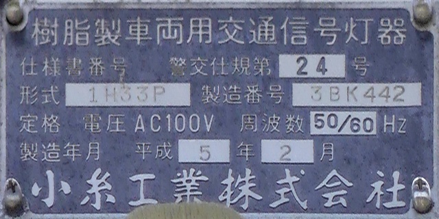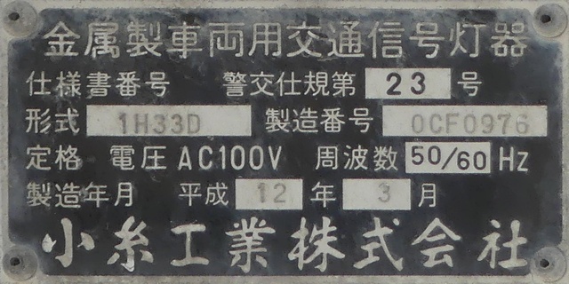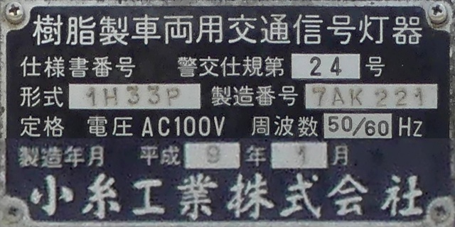 LED式灯器を使用したもので、それぞれのレンズの内側にマスクを取り付けています。銘板に打刻された形式「1H3RRRDL」の「RRR」の部分は「赤・赤・赤」配列の灯器であることを表しています。
