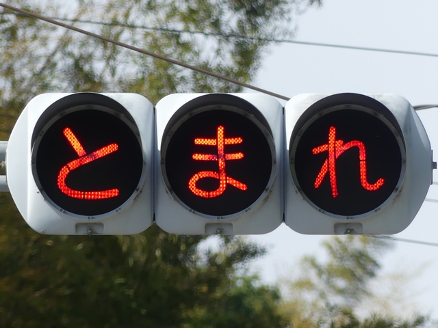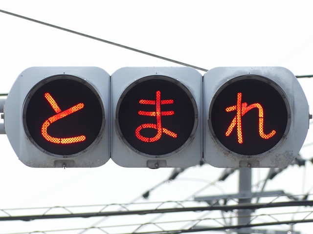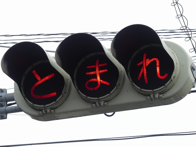 信号柱には「広告禁止・公安委員会」のシールが貼られています。