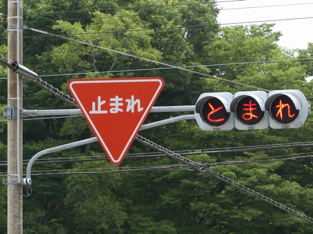 信号のない交差点の一時停止規制側道路に「とまれ」と表示する灯器が設置されています。通常は滅灯しており、交差点の約40m手前にある感知器で接近車両を感知すると表示が点滅します。
