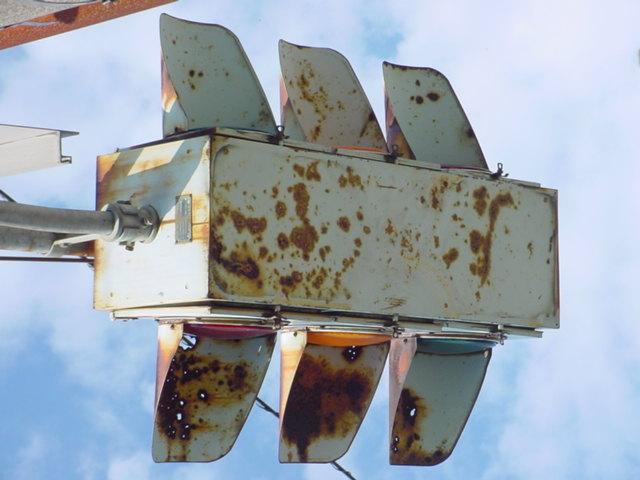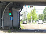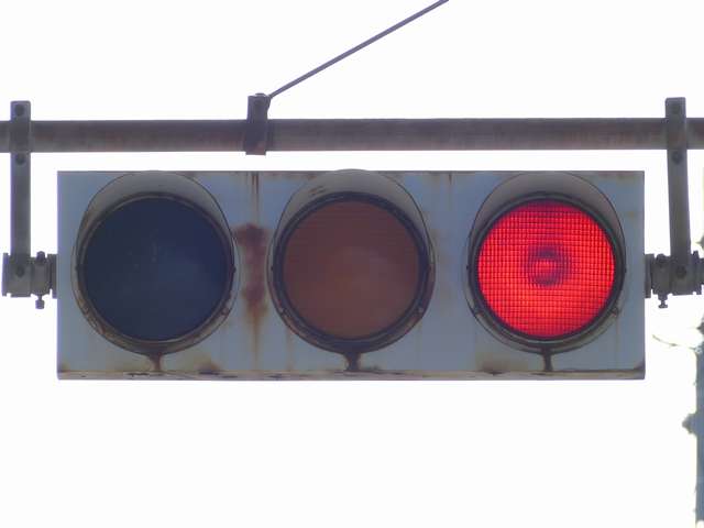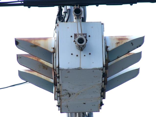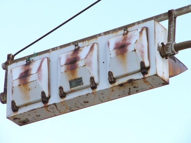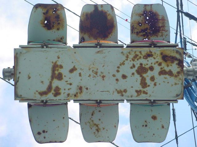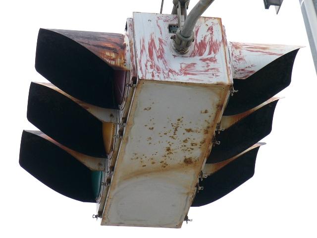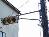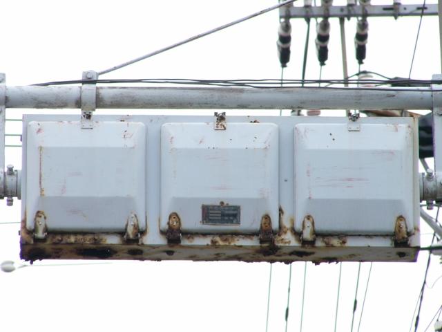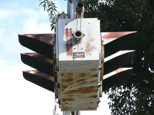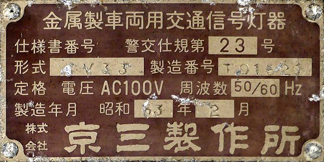京三製作所製の初期の丸型灯器です。高架下の低い位置のため、縦型灯器が使用されています。昭和53年2月製です。