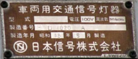 日本信号製の直径250mmレンズ灯器です。名称は「車両用交通信号灯器」となっており、銘板は側面下部に付いています。
