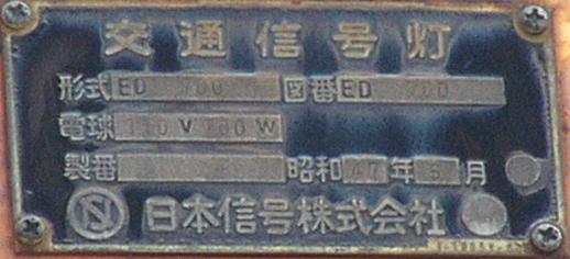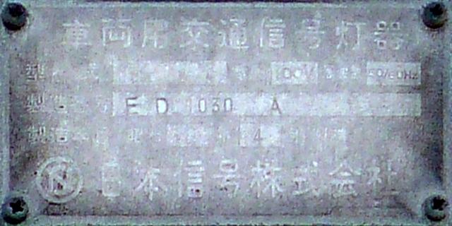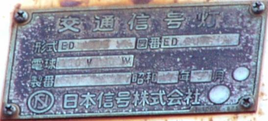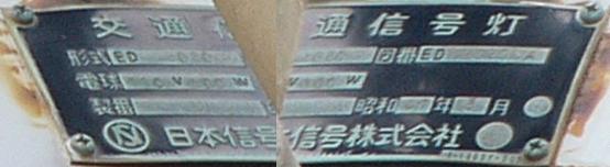 日本信号製の直径300mmレンズ灯器です。名称は「交通信号灯」となっており、銘板は背面下部に付いています。