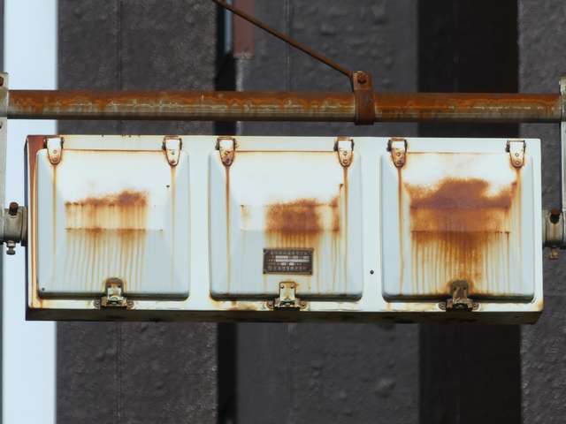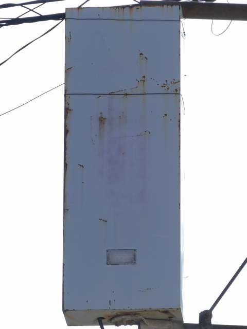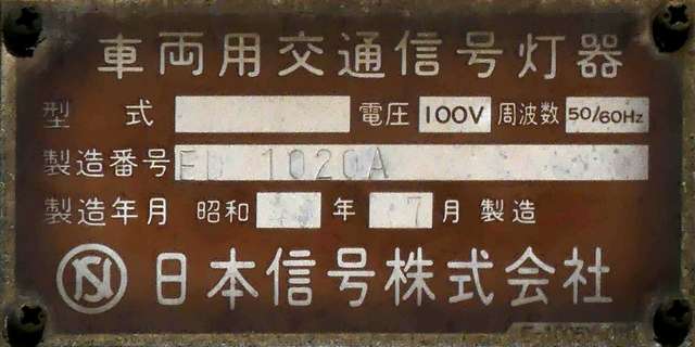 日本信号製の直径250mmレンズ灯器です。名称は「交通信号灯」となっており、銘板は側面下部に付いています。