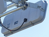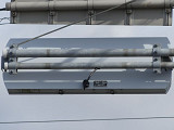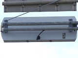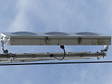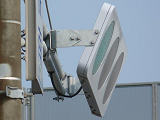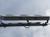 R8の「南新保南」交差点に試験設置されているフラット型灯器です。平成21年度末現在、県内ではこの1箇所のみで設置されています。フードが無く、積雪や風に強いということでの設置ですが、正面から雪が吹き付けたときに、灯器表面に雪がびっしり付いて、灯火が見えなくなることはないのでしょうか。