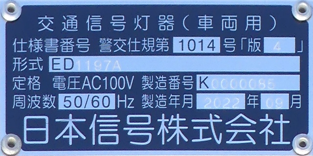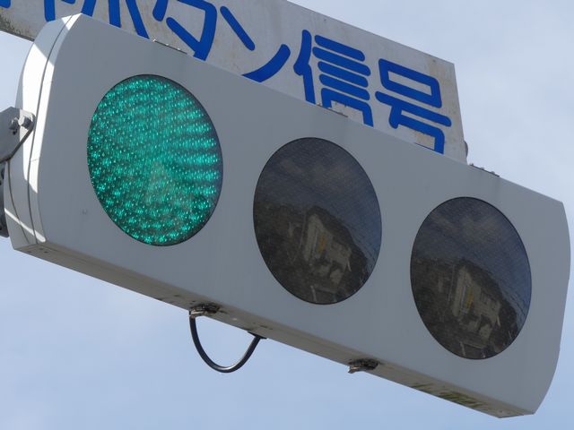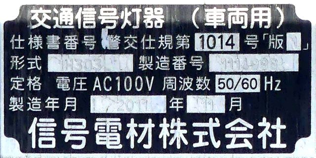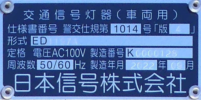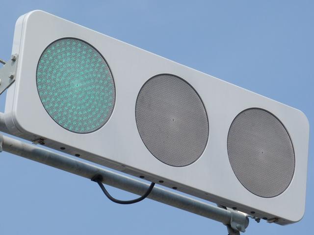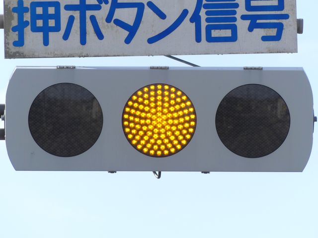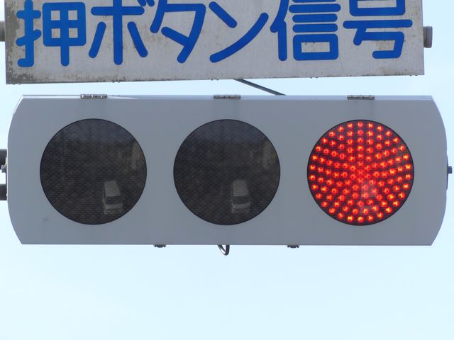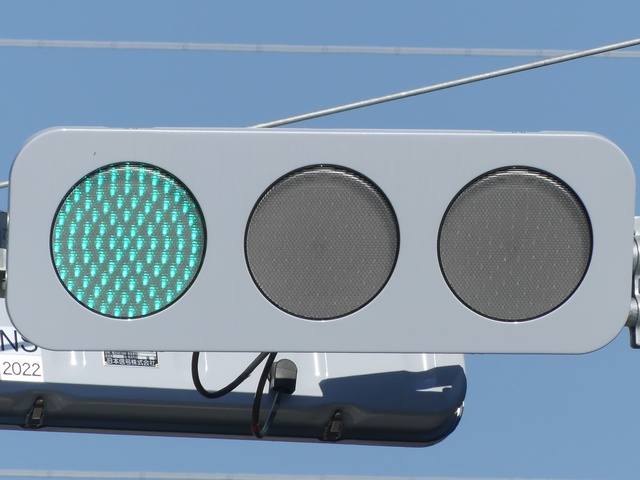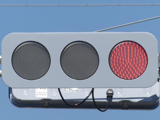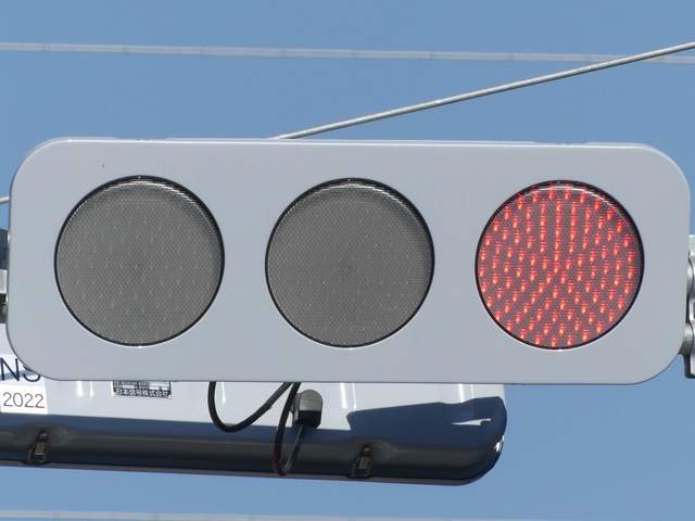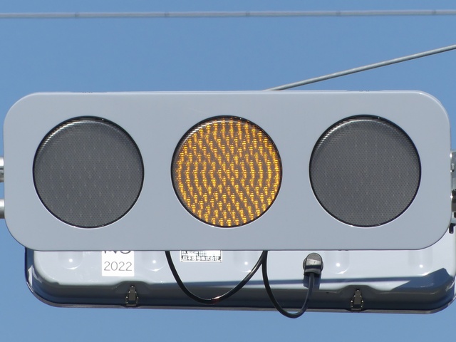 光り方から、使用しているLED球はエクセル製の「くりくり信ちゃん」か常盤電業製の「TYライト(TYDタイプ)」と思われます。なお、通常のLED式灯器で見られるデジカメを通して見たときに灯火がゆっくり点いたり消えたりする現象(西日本の場合)は見られません。