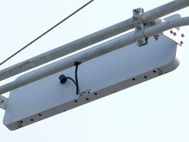 2022年秋ごろに主に埼玉県で設置された表面がフラットな日本信号製のフードレス灯器です。レンズ面もフラットです。ウラ面には従来の低コスト灯器と同じで凹凸があります。フードレスで前傾をつけて設置する必要があり、前傾用金具を挟んで設置しています。