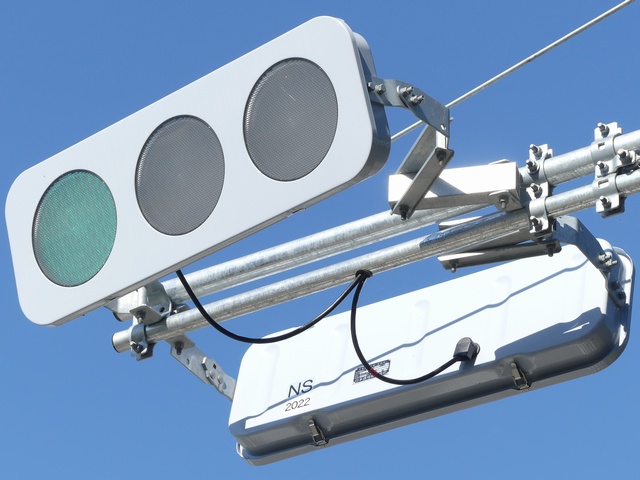 石川県では、この交差点に8台設置されています。埼玉県で設置されているものと同じく、ウラ面にメーカー略称の「NS」と設置年度の「2022」のラベルが貼られています。