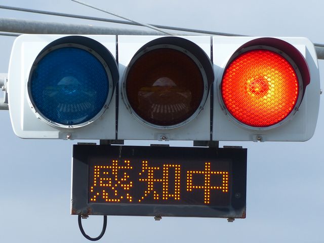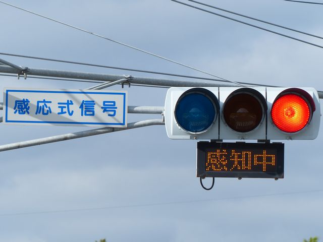 「感応式信号」で、車両を感知するか歩行者が押ボタンを押下すると「感知中」の表示が点灯します。