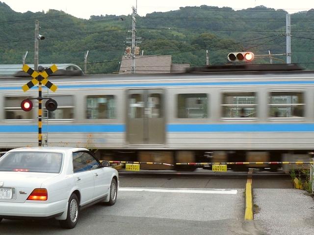 踏切の奥の交差点で使用されています。ドライバーが踏切信号と勘違いしてしまった場合、青信号だと危険なので、赤点滅にしているようです(青にならないため、黒い蓋がされています)。車両は踏切で道交法に従って一時停止した後、交差点でこの信号に従って一時停止することになります。