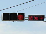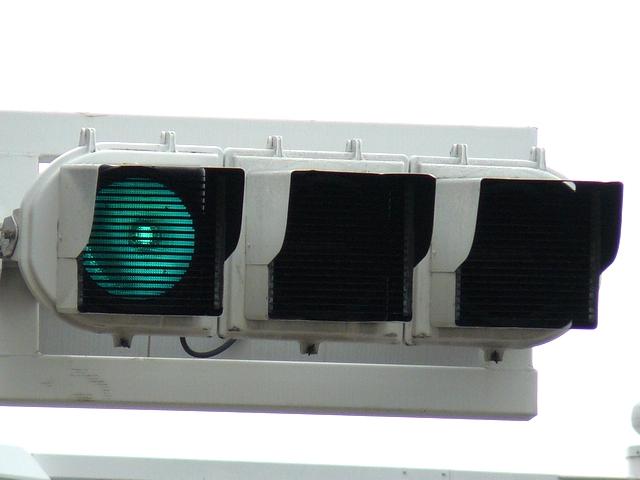 連続交差点のため、誤認防止のために距離制限フードが使用されています。灯器は珍しい信号電材製の直径250mm多眼レンズです。