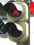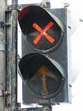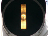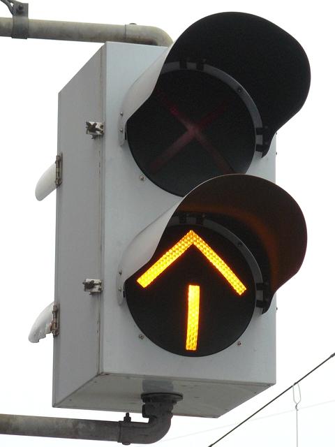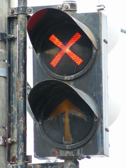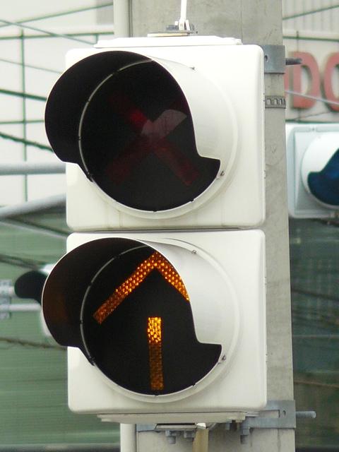 2位式の両面灯器です。青信号のときに黄矢印が点灯し、それ以外のときには「×」が点灯します。