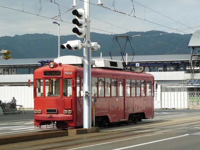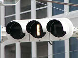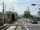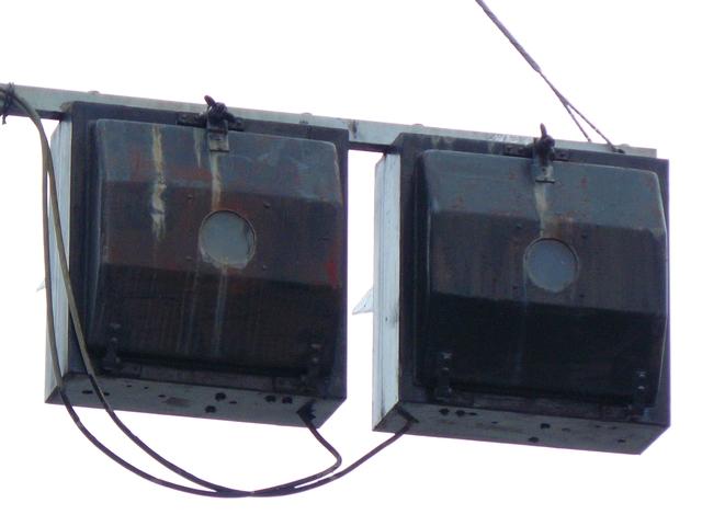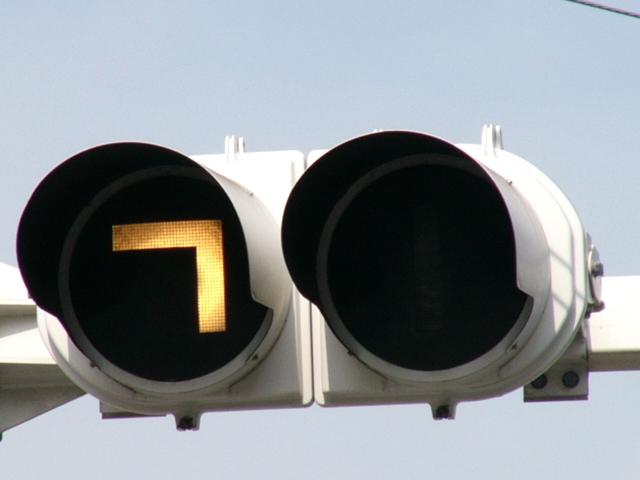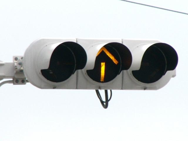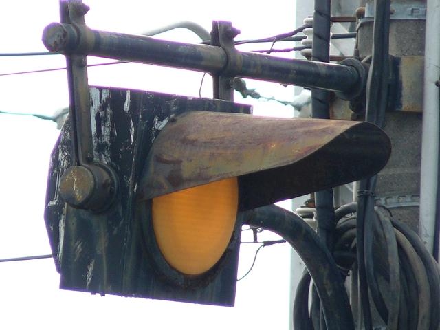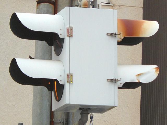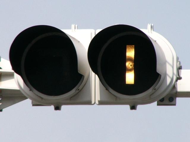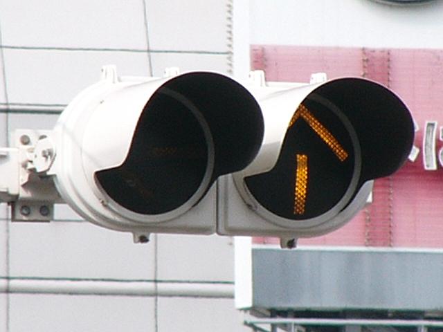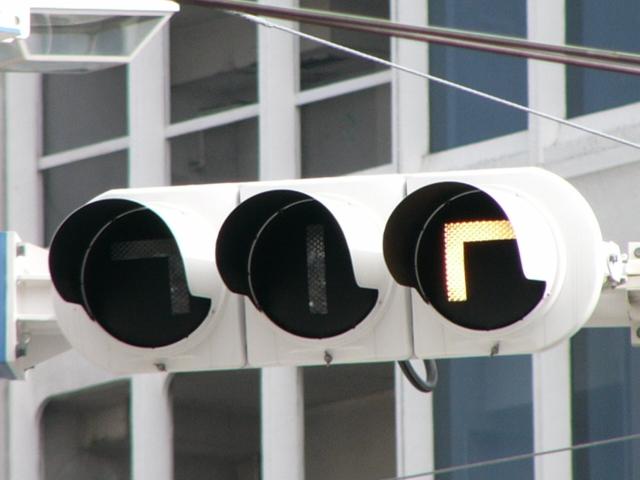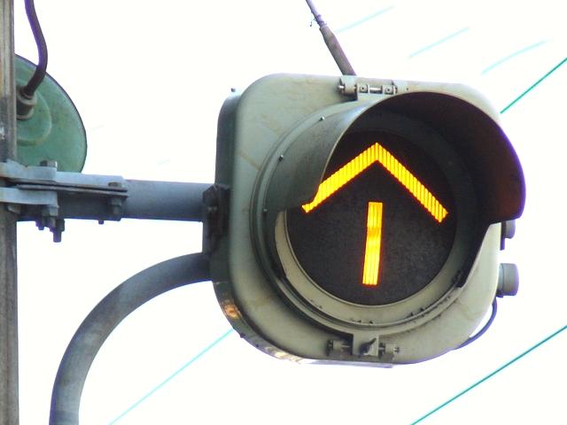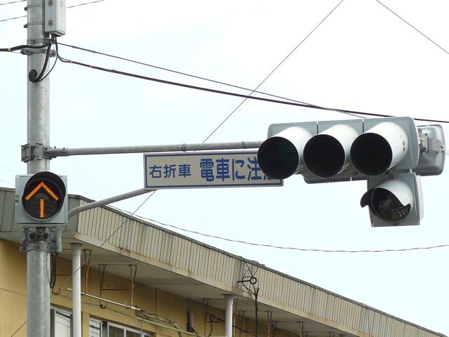 3位式灯器を使用していますが、上と真ん中は黒い蓋がされていて、使用されているのは下の黄矢印だけです。交差点の形状上、信号が赤でも他の交通と交錯することなく電車が進行できるため、時差作動中や赤信号のときに黄矢印が点灯します。