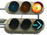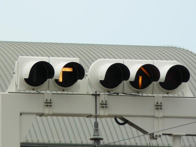 矢印式の「時差信号」ですが、時差作動中、青矢印だけでは電車が進行できないため、黄矢印も表示されます。