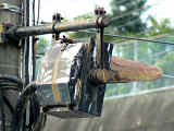 ポイントのある交差点の手前に設置されています。交通信号灯器を使用していますが、路面電車軌道のポイント切り替え操作用の信号だと思われます。「┐」と「│」の表示が交互に点灯します。「┐」の時に電車が動作すると左折、「│」の時に電車が動作すると直進できるようポイントが切り替わり、交差点の電車用矢印信号がその方向のみ点灯するようになるのでしょう。