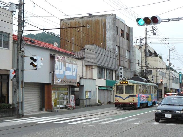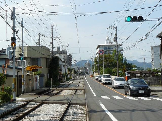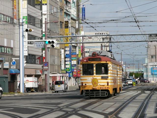 ┤形交差点で時差信号となっており、時差作動中でも路面電車が進行できるよう黄矢印信号が設置されています。