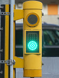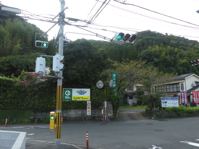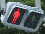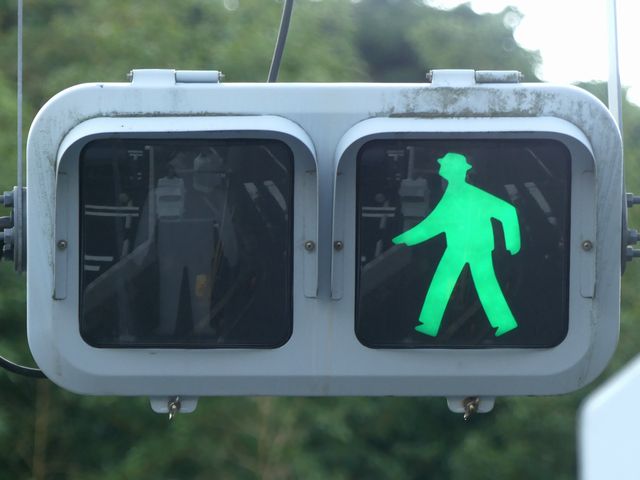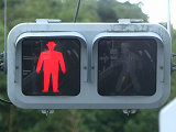 交差点西側の路肩が狭く、信号柱を設置すると歩行者の通行の妨げになるため、東側の信号柱からアームを伸ばして車道の上空に横型の歩行者用灯器を設置しています。歩行者用のため、灯火の配列は車両用とは逆で左から赤・青となっています。