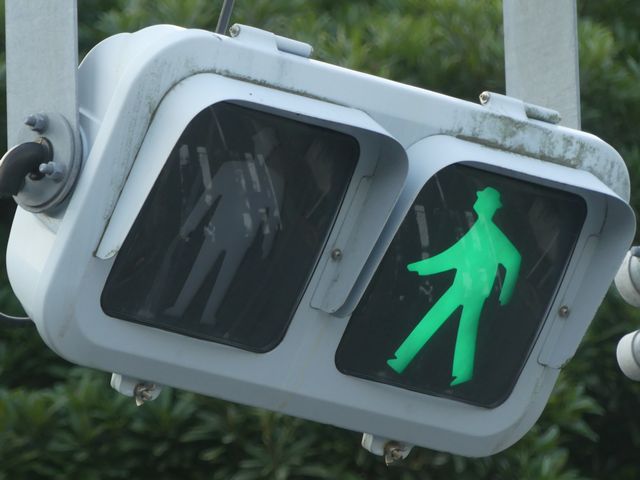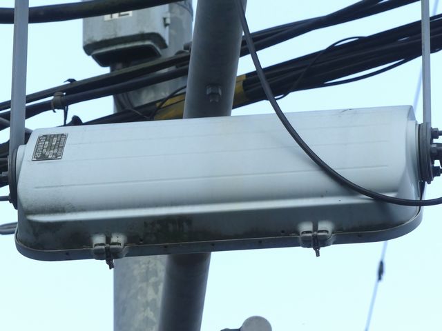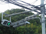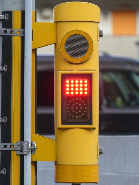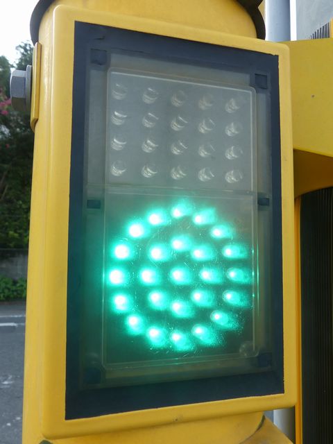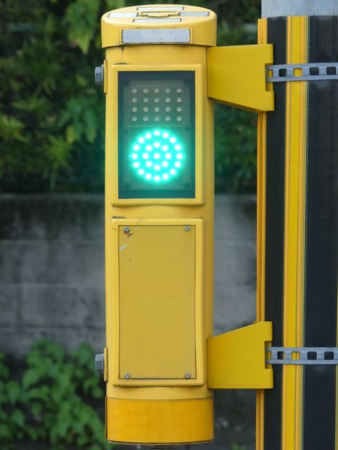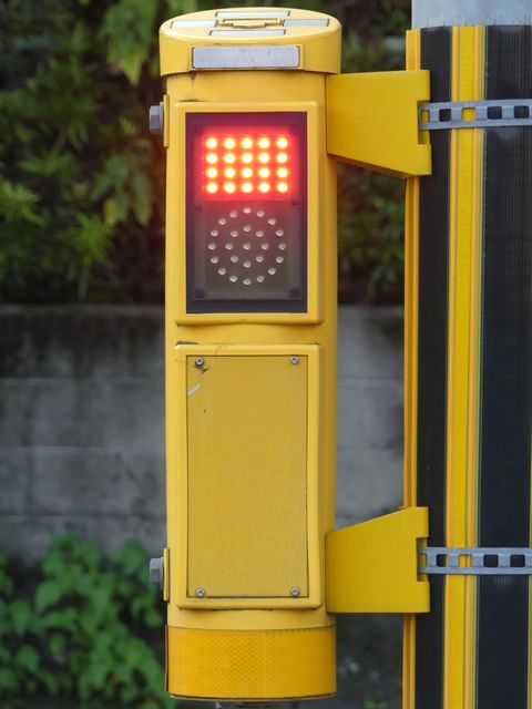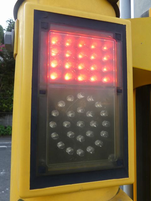 ただし、歩行者の位置からは見上げるような場所であり、信号が見づらいため、「高齢者・視覚障がい者用LED付音響装置」を併設しています。 LED表示は、歩行者用灯器の信号と同じ色の灯火が表示されます。装置は歩行者が信号灯火を確認する目的のみで設置されているためか、音響信号は流れず、また、上面の点字の案内はありません。